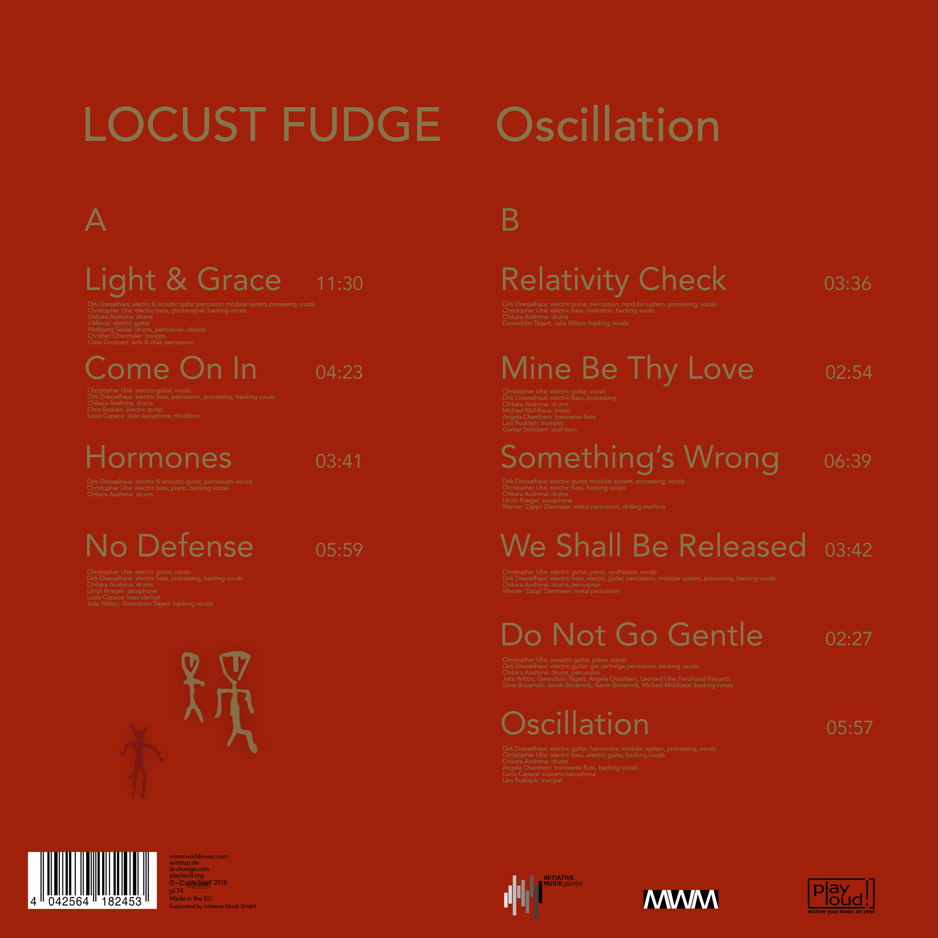 All music performed, recorded & mixed between 2015 - 2017 at ZONE, Berlin. Additional overdubs recorded at various locations around the world. Engineered and mixed by Dirk Dresselhaus. Produced by Locust Fudge. A1, A3, B1, B3, B6 written by Dirk Dresselhaus. A2, A4, B2, B4, B5 written by Christopher Uhe. Lyrics on B2 by William Shakespeare, Lyrics on B5 by Dylan Thomas. Published by Edition MirrorWorldMusic / Wintrup Musikverlag / La Chunga music publishing. Mastering by Rashad Becker at Dubplates & Mastering, Berlin. Photography by Risto Pentikäinen. Sleeve design by Lucía Palacios. Locust Fudge would like to thank everyone involved.
