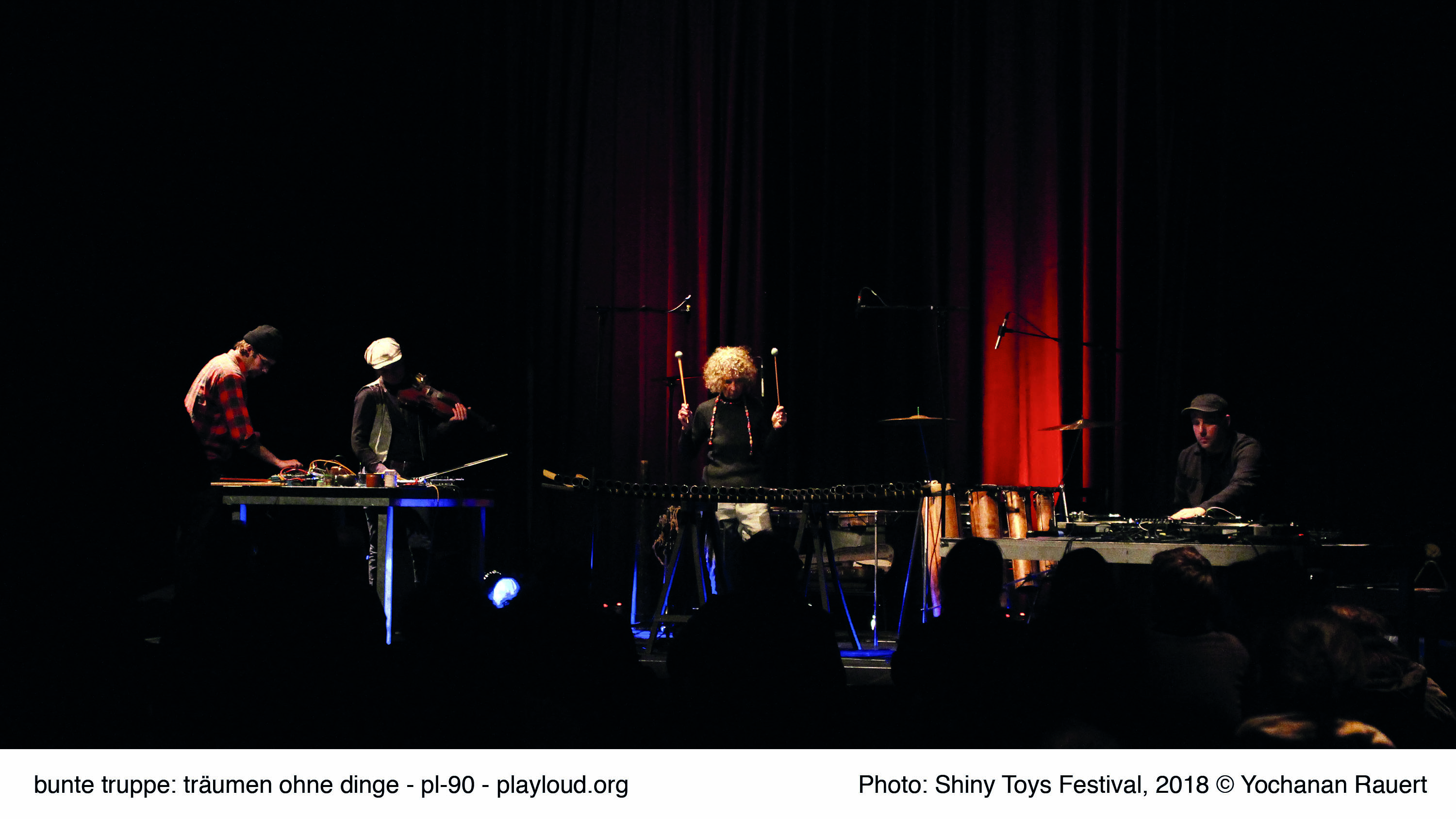 Im einleitenden Satz der programmatischen Vorstellung einer Musikgruppe wird zunächst ihr Name genannt werden und die Musiker*innen sowie die Instrumente, die jene spielen; auch ihr Gründungsjahr mag Erwähnung finden. Man wird während des Lesens dieser Zeilen folglich in Erfahrung bringen, dass die Bunte Truppe sich 2017 zusammengefunden hat und aus Limpe Fuchs, Ruth-Maria Adam, Ignaz Schick und Ronnie Oliveras besteht, die mit einer Vielzahl von Schlag-, Blas- und Saiteninstrumenten sowie diversen elektronischen Mitteln vor ihr Publikum treten. An dieser Stelle ist es unbedingt notwendig, darauf hinzuweisen, wie eine solch’ Bunte Truppe auf der Höhe ihrer Zeit agiert und sich improvisierend jenseits sogenannter Genregrenzen und musikalischer Konventionen bewegt. Selbstverständlich schließt diese vollmundige Ankündigung mit ein, dass die Bunte Truppe es auf diesem Wege versteht, ihr Publikum herauszufordern! Natürlich.