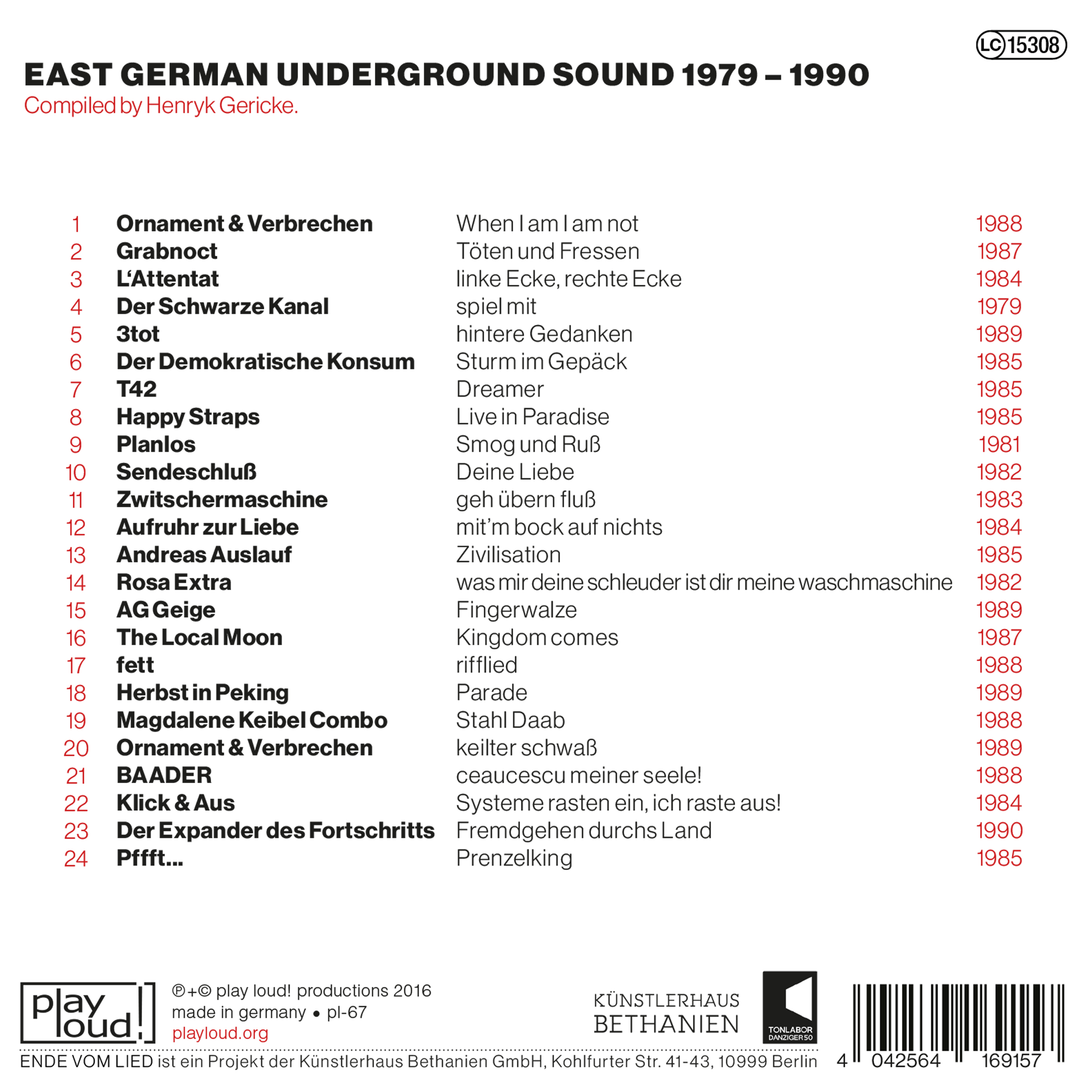 ENDE VOM LIED* is a genre-spanning collection of punk, post-punk and avant-garde bands from the former East Germany, chronicling the work of free spirits pitted against government restraints and implied genre limitations. The underground scene in the GDR was a hydra, a noisy mix of musicians, poets, pain¬ters, photographers, filmmakers, punks and freaks. In the immediate aftermath of the primal scream that was punk, music often bred with poetry or painting in short-lived liaisons or enduring collaborations to produce a new generation of genre bastards. With the lines blurring between forms, a search for new shapes began. In the German Democratic Republic, this search constituted a tightrope walk, a dance for expression between subculture and a dictatorship.